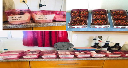 في فترة انتشار جائحة كورونا لم تتمكن المهندسة وزملائها من زيارة المحصول يوميًا لإجراء التجارب، لذلك ذهبت بتاريخ 4/4/2021 وكانت المرة الثانية، وفيها حصلت على عينات، كل عينة تتكون من 6 حبات قياسية، وأُجريَ عليها فحص الوزن واللون، وبما أن الصمغ يذوب بالماء الساخن أو البارد، تمت إضافة لتر ماء مع التحريك، ومن ثم نقع الفراولة بالصمغ المحلول بالماء لخمس دقائق، ثم التخزين بدرجة صفر بالثلاجة (درجة التخزين الطبيعية للفراولة)، واستمرت فترة التجربة من 29/3 حتى 22/4، وفي الأيام الموافقة لهذا التقويم 29/3 و4/4 و11/4 و15/4 و22/4 كان تؤخذ القياسات كل يوم فيها وتُسجّل، إلى حين اليوم الأخير، حين بدأ يظهر عليها علامات تلف المحصول.