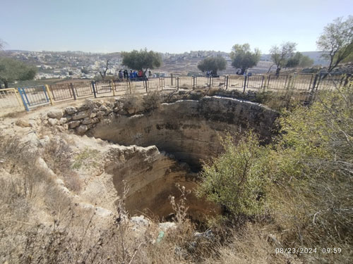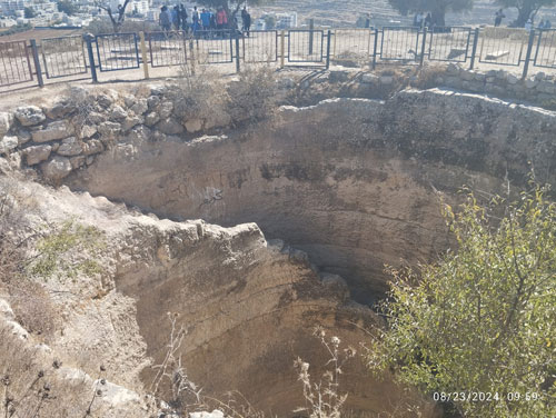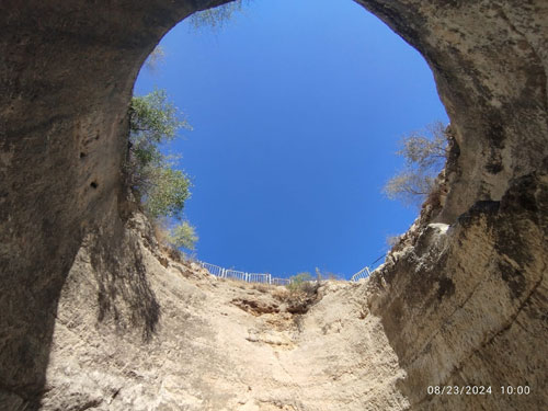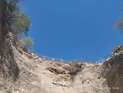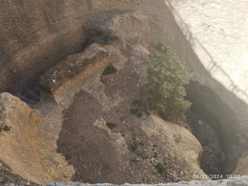 وصلنا إلى المكان الأثري الذي يحوي مركزه بِركة عظيمة محفورة في الصخر بارتفاع نحو 15 متراً، وبقُطر حوالي 20 متراً، محاطًا بحماية معدنية خوفاً من السقوط، ويتم الوصول لأسفله بواسطة 47 درجة محفورة في الصخر.
