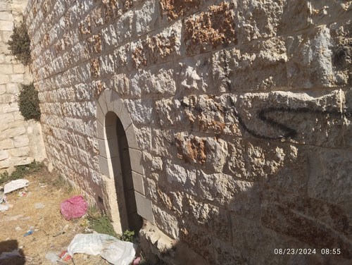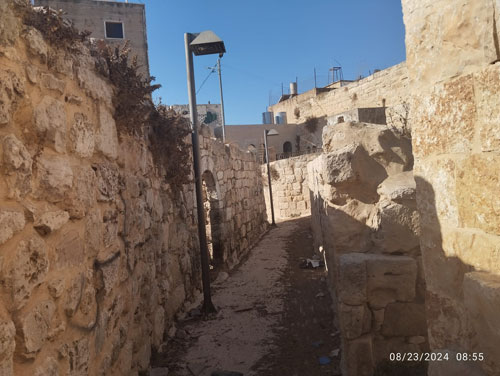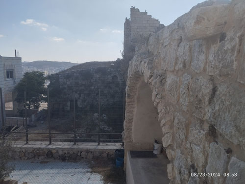 وسرنا نزولاً في اتجاه طريق ترابية، وعلى يسارنا "وادي المنية" الذي تلوثه مياه الصرف الصحي القادمة من مستعمرة بيسغات زئيف، وعلى اليمين أراضٍ جبلية جرداء إلا من "شجيرات النتش" المعمرة الشوكية، مررنا بأرض حرجية محمية بشبك معدني وبقربها أرض أخرى مزروعة بأشجار الزيتون، ومن ثم انعطفنا يساراً باتجاه الوادي.