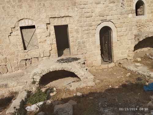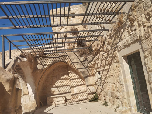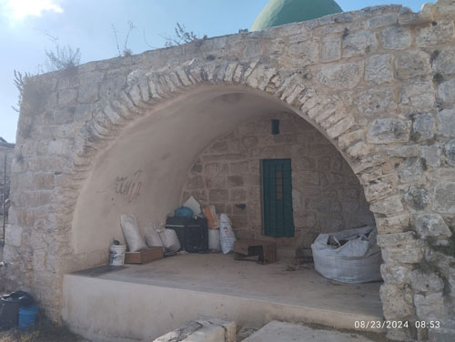 سُقف المبنى، بعد وضع الدوامر "المواسير" المعدنية وسقفه بالخرسانة، وتثبيت جدرانه الحجرية وتبليط أرضيته، وعلى يسار هذا المبنى يوجد مقام ذو قبة خضراء.