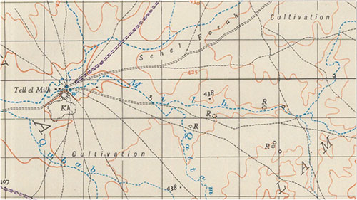 خريطة من أربعينيات القرن الماضي لمنطقة تل الملح وتظهر فيها الآبار والوديان والسهول التي كانت تزرع بالشعير (غالبًا)- من موقع Palestine open maps[2]