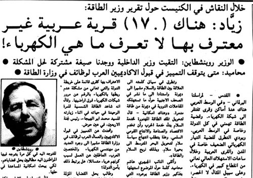 صورة عن تقرير يتطرق لأزمة الطاقة في القرى العربية ويذكر بدء استخدام الطاقة الشمسية لتعزيز صمود أهالي عين حوض - صحيفة الاتحاد 14.1.1993