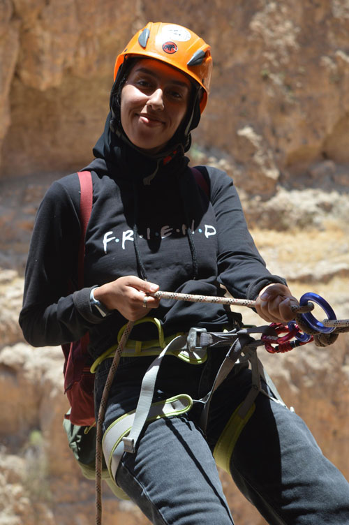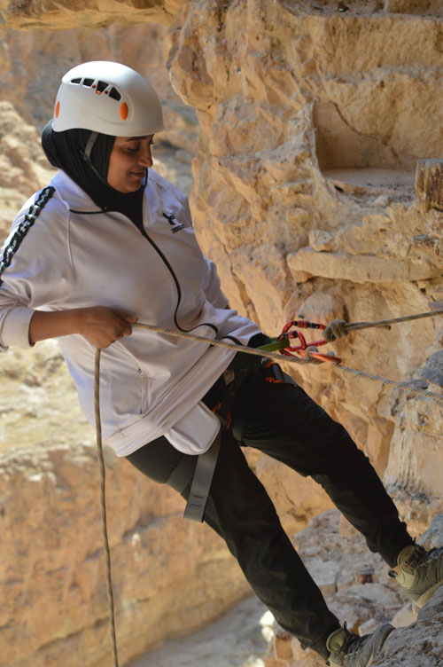 | المستغورة سارة الصايج من بير زيت خلال مرحلة الإنزال الثانية نحو الوادي |