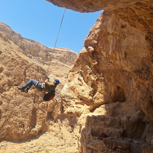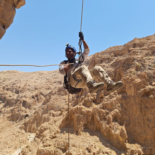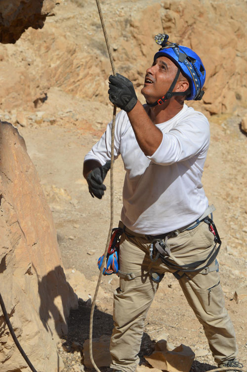 الباحث المستغور خالد أبو علي معلق في الهواء خلال عملية الإنزال نحو دير وادي المقلق |