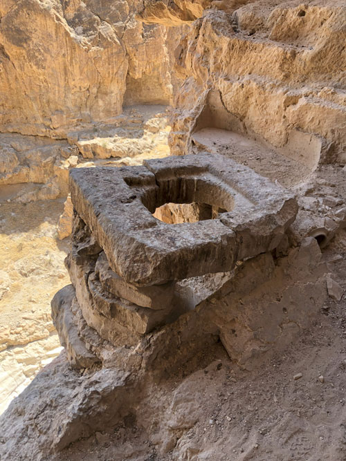 | فوهة أحد آبار جمع مياه الأمطار على مدخل الدير في الجرف الصخري |