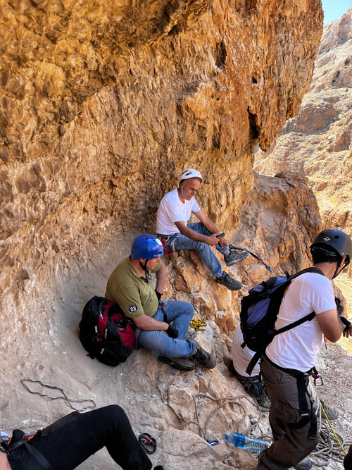 | استراحة اعضاء الفريق وسط الجرف الصخري في وادي المقلق |
