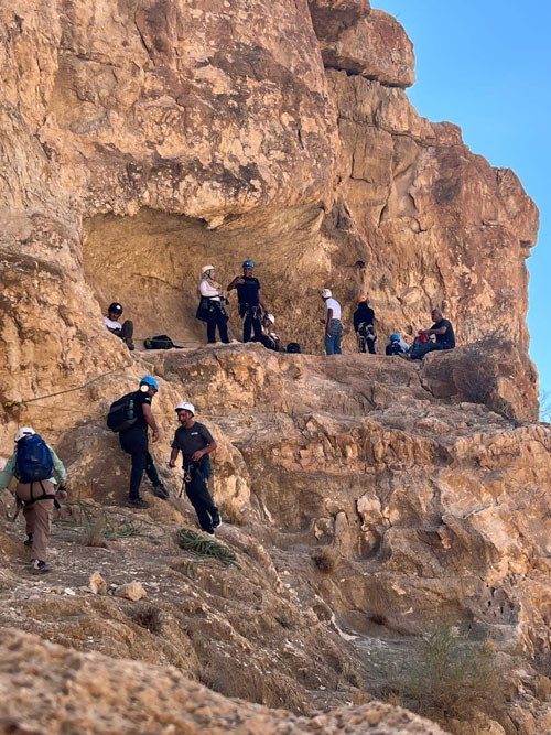 استعدادات الفريق لتسلق الجرف الصخري فوق دير وادي المقلق |